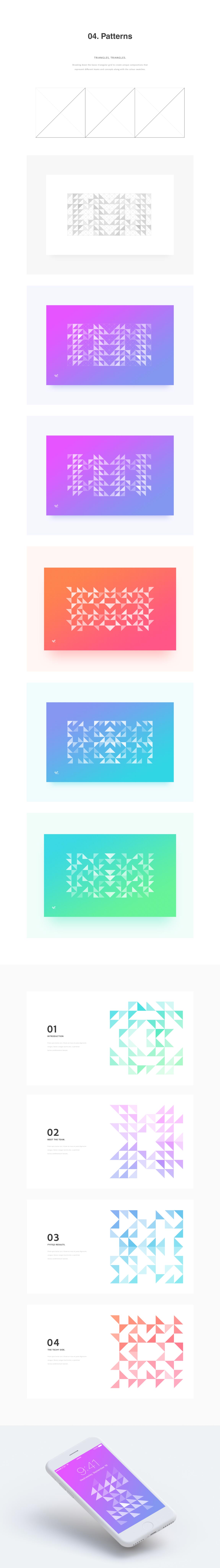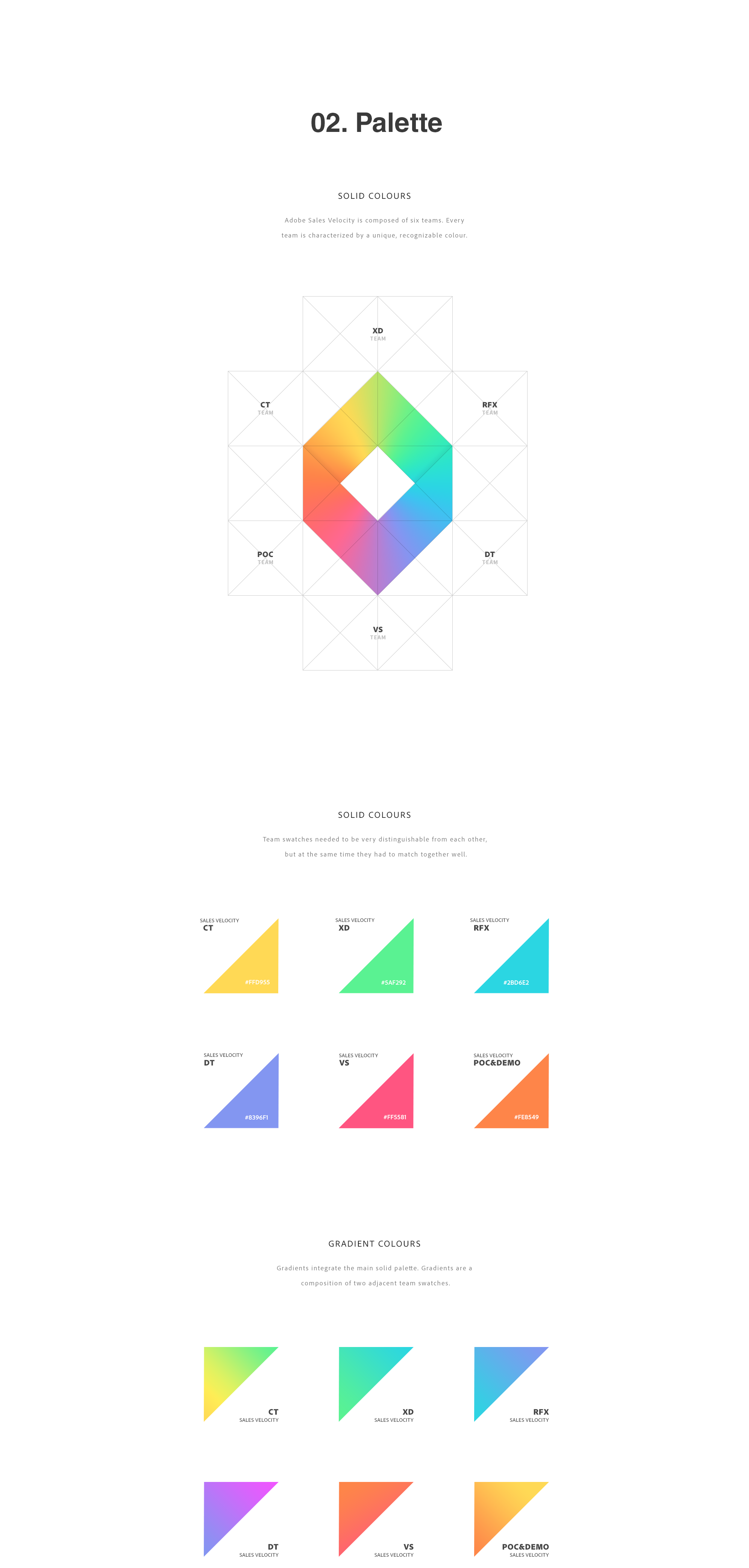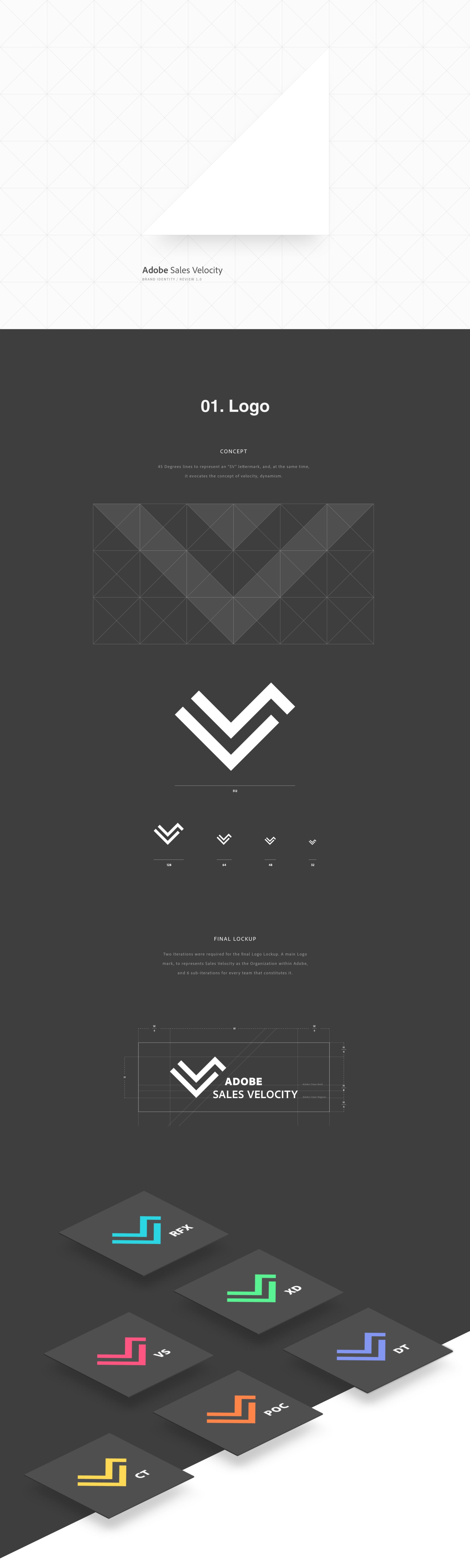 Logo and branding system for Adobe Sales Velocity. The deconstruction of a triangular grid represents the main branding concept; as a foundation to generate unique patterns that identify every of the six teams composing the organization, and to create the logo itself.